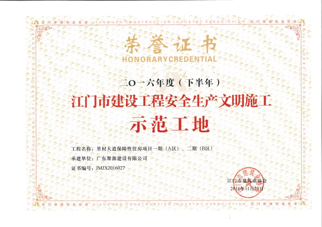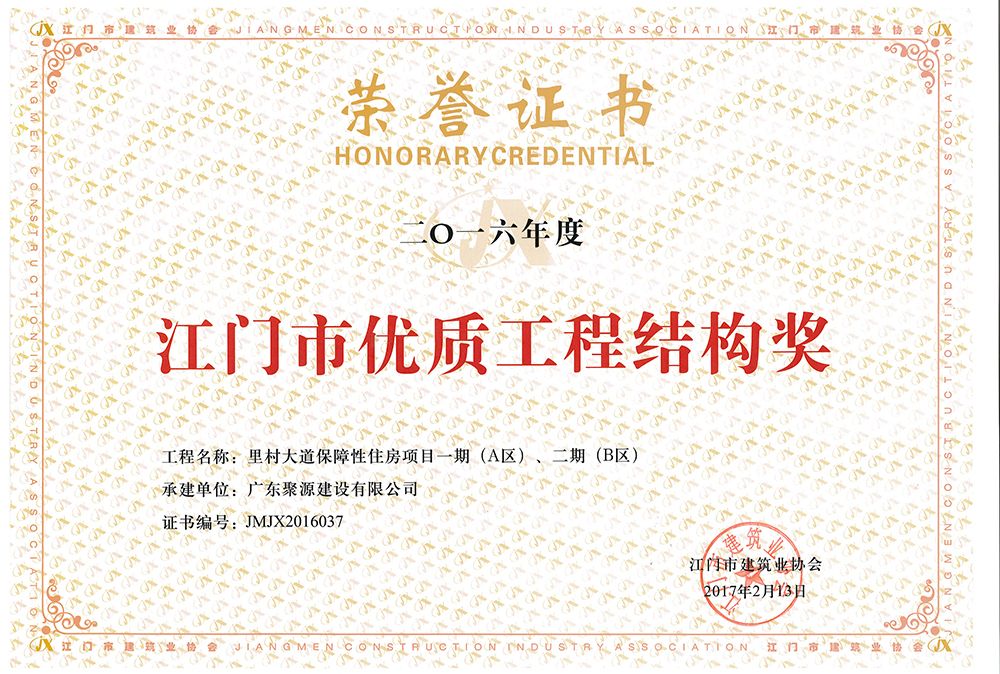 该项目自开工以来,此前已获得“江门市优质工程结构奖”、“江门市建设工程安全生产文明施工示范工地”、“广东省建设工程优质结构奖”、“广东省房屋市政工程安全文明施工示范工地”、“一星B级绿色建筑设计标识证书”。