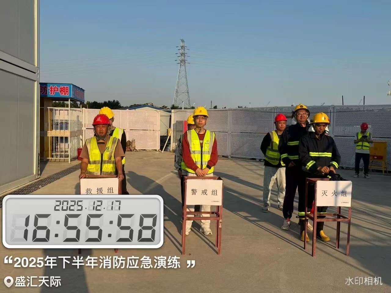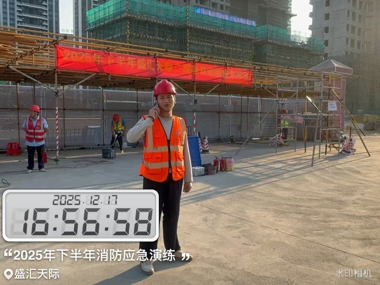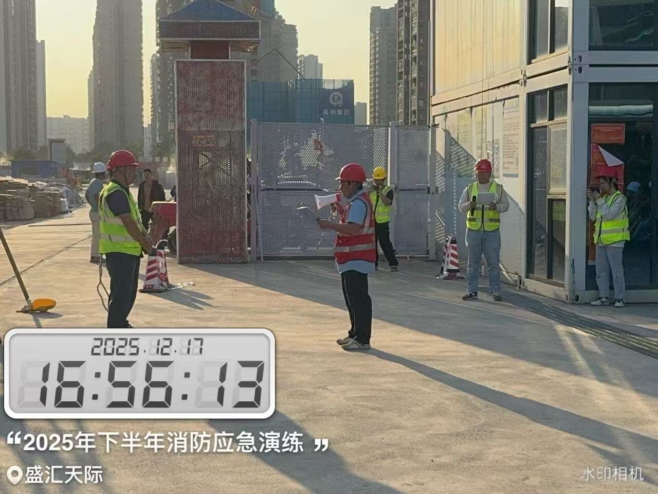 本次消防演练设计严谨,力求贴近实战。随着演练总指挥一声令下,模拟火灾警报在盛汇天际二期项目工地响起。发现“火情”后,项目安全员立即启动应急响应程序,第一时间向指挥部报告并拨打模拟火警电话。 各应急小组闻令而动。疏散引导组迅速就位,指引现场作业人员按照日常训练熟悉的疏散路线,快速有序地向指定的安全集合点撤离。